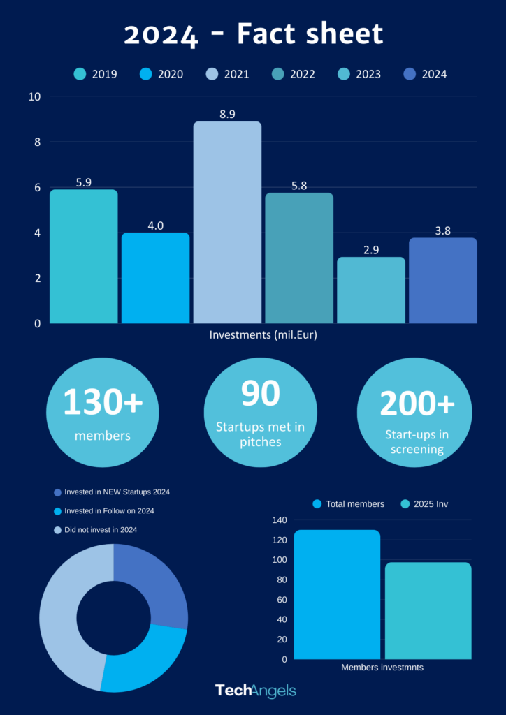 In 2024, TechAngels members invested a total of €3.777 million, a 25% year-on-year increase. The second half of 2024 saw a particularly strong surge, with €2.757 million invested—nearly triple the first half’s activity.