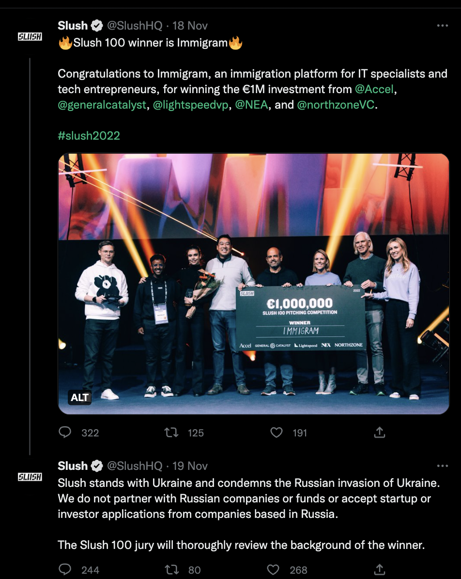 Immigram Co-founder Mirolyubova condemned the Russian invasion and called Slush’s decision totally political, not business-related. She argues that the company presently has no employees in Russia and conducts no business there. The startup previously indicated that if it received the Slush 100 investment, it would contribute $100,000 to NGOs that assist Ukrainian immigrants and refugees.